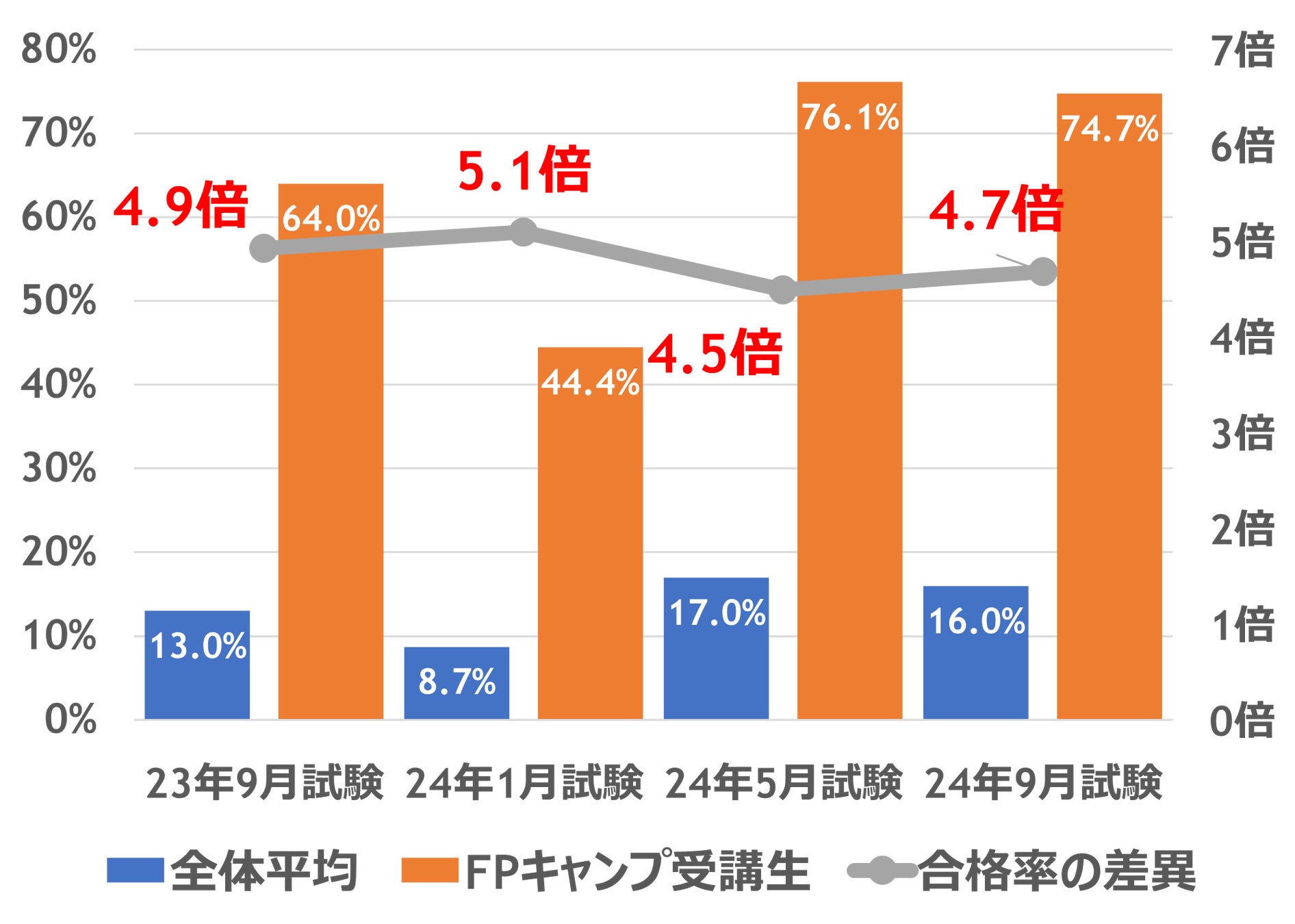 2024年9月FP1級学科試験の総受検者に占めるFPキャンプ受講生の割合は29.1%※1を記録、総受検者4,312名の約3割をFPキャンプ受講生が占めました。総受検者に占めるFPキャンプ受講生の割合は、FPキャンプが開講した2023年7月以降の試験において4回連続で右肩上がりの伸びを見せています。2024年9月試験におけるFPキャンプ受講生の合格率は74.71%※2で、全体の合格率15.95%の4.7倍を記録。2023年7月以降の試験において、4回連続で全体合格率の4.5倍を超える合格率を達成しました。