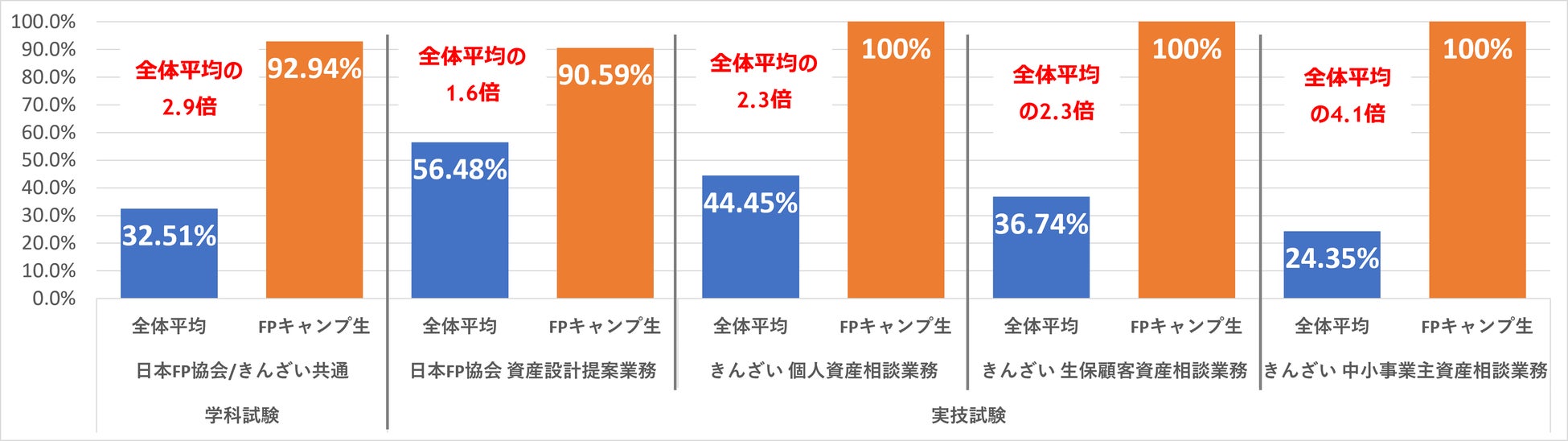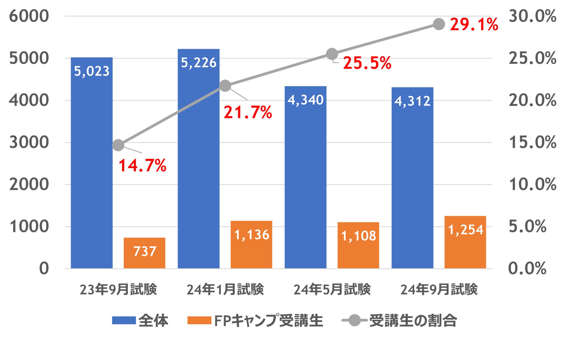 FPキャンプ:FP1級学科試験に占める受講生割合は29%、合格率は全体の4.7倍の75%/FP2級試験の合格率は学科試験・実技試験ともに9割超