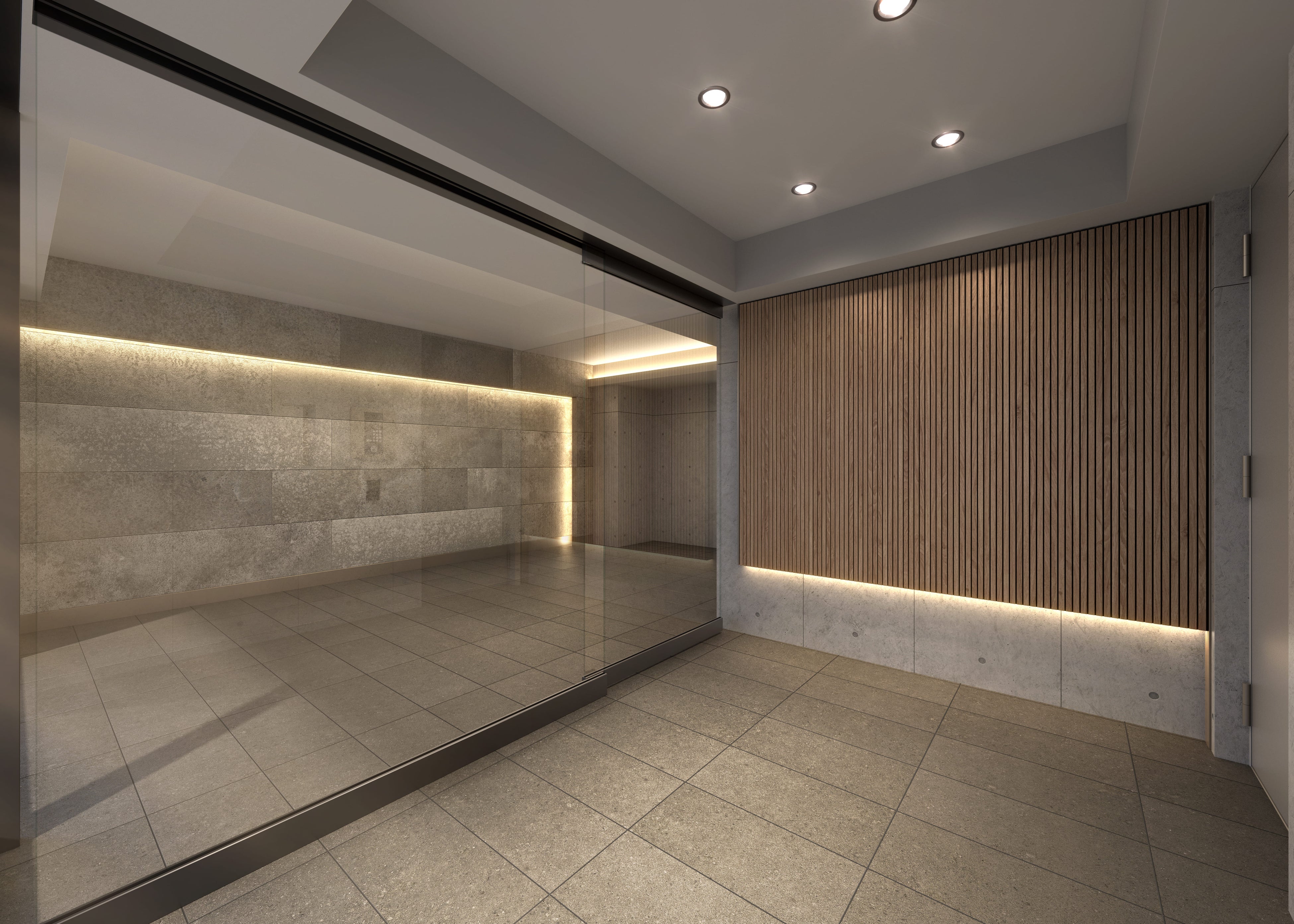また、エントランスの壁面には天然石調タイル、それに向き合うクールなガラス素材の壁、ぬくもりを感じる木調のアクセントなど、アイキャッチとなる多彩なマテリアルを採用しています。