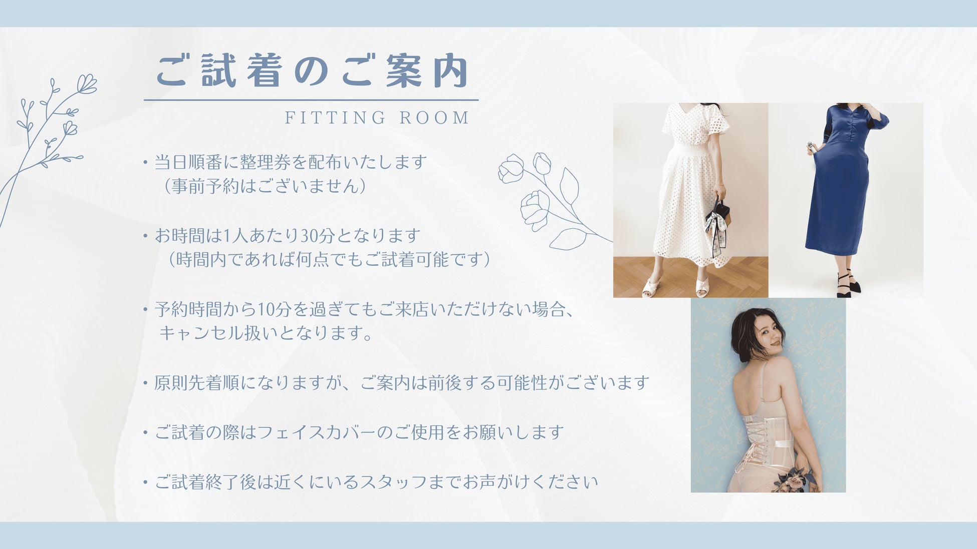ご試着は事前予約制ではなく、当日順番に整理券を配布いたします。