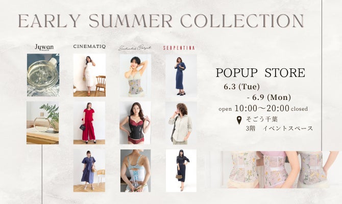 株式会社Alyo(本社:東京都港区、取締役社長:大橋茉莉花)は、6月3日(火)〜6月9日(月)の期間中、そごう千葉にて、POPUPを開催いたします。本イベントでは、CINEMATIQ・Enchanted Corset・SERPENTINA・Juwan のブランドが一堂に会し、夏の新作もお試しいただけます。