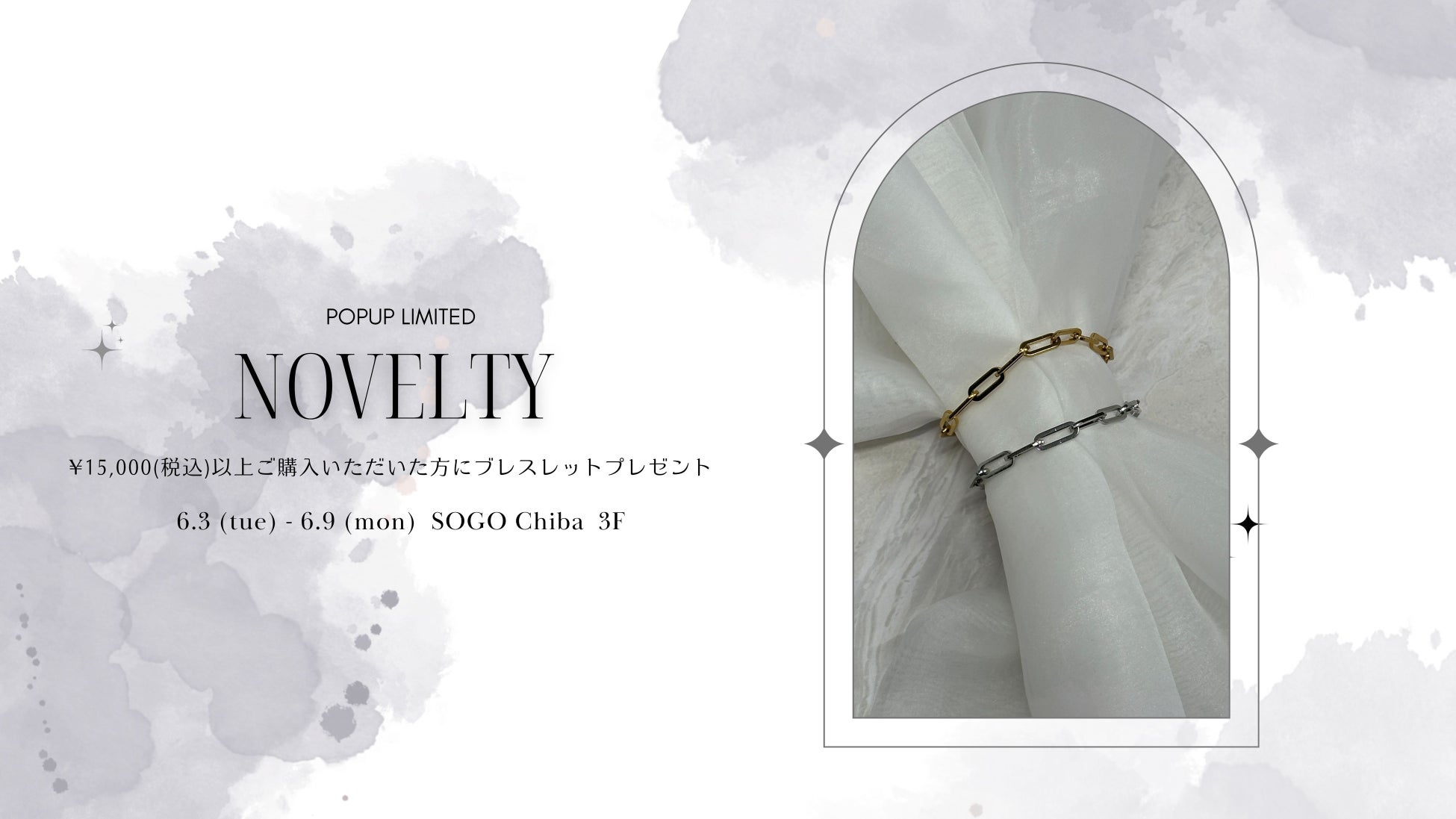 6/3(火)~6/9(月)のPOPUP期間中、1回のお会計で15,000円以上お買い上げいただいた方には、チェーンブレスレットのノベルティーを先着順でプレゼント。