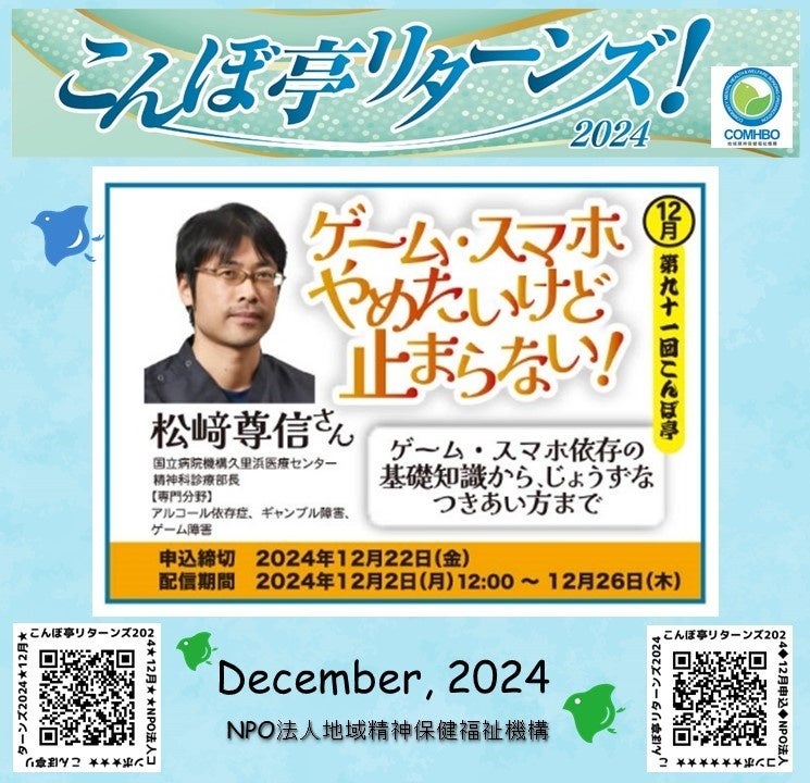 【NPO法⼈地域精神保健福祉機構・コンボ】こんぼ亭リターンズ2024(12月)「ゲーム・スマホ依存の基礎知識からじょうずなつきあい方まで」:動画配信中!(12/26まで;申込締切12/22)