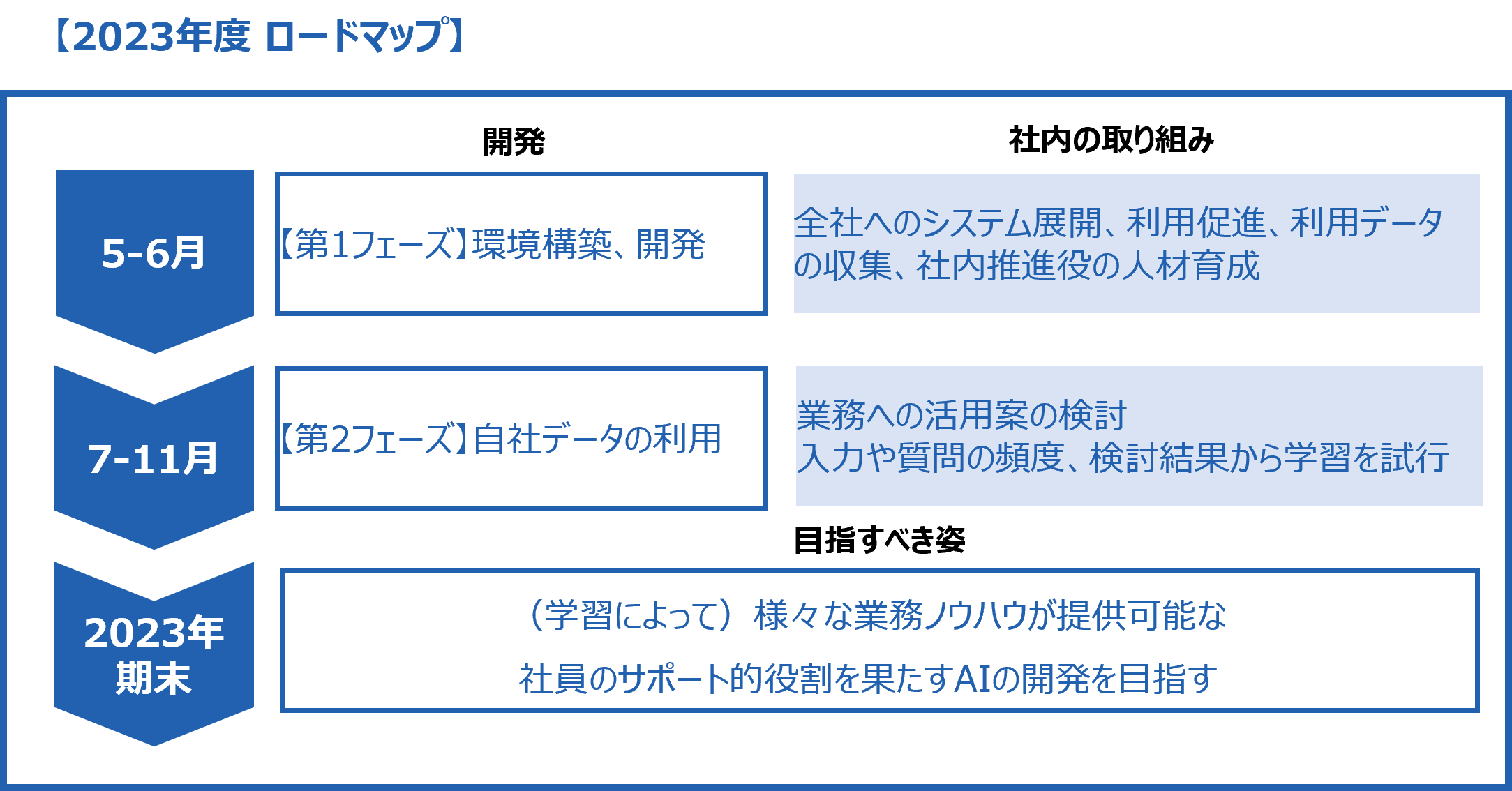 今回導入した「NK-AIbot-D1 Powered by GPT-4」は、自社データの利用を可能にする開発第2フェーズの段階となっています。2023年度内には質問の文脈から質問者の意図を読みとり、より的確な回答ができるよう機能面の向上を目指します。また、業務の標準化や効率化、サービス品質の平準化に資するAIとして開発をすすめるとともに、マニュアルの整備や勉強会の実施等、今後も国内外のグループ会社を含めた全社的な活用を促進してまいります。