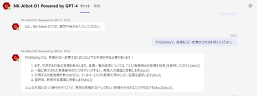 ▲当社グループ基幹システム「POSSibility」のマニュアルを学習させ、使用方法に関する質問をした際の回答イメージ