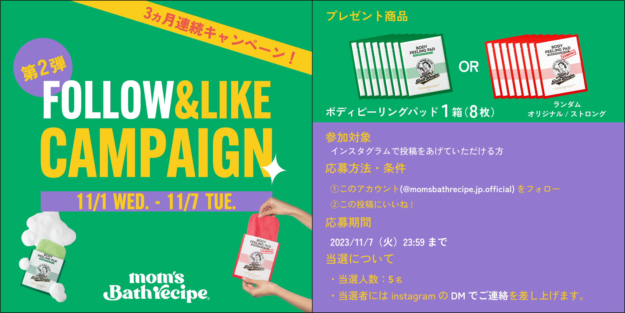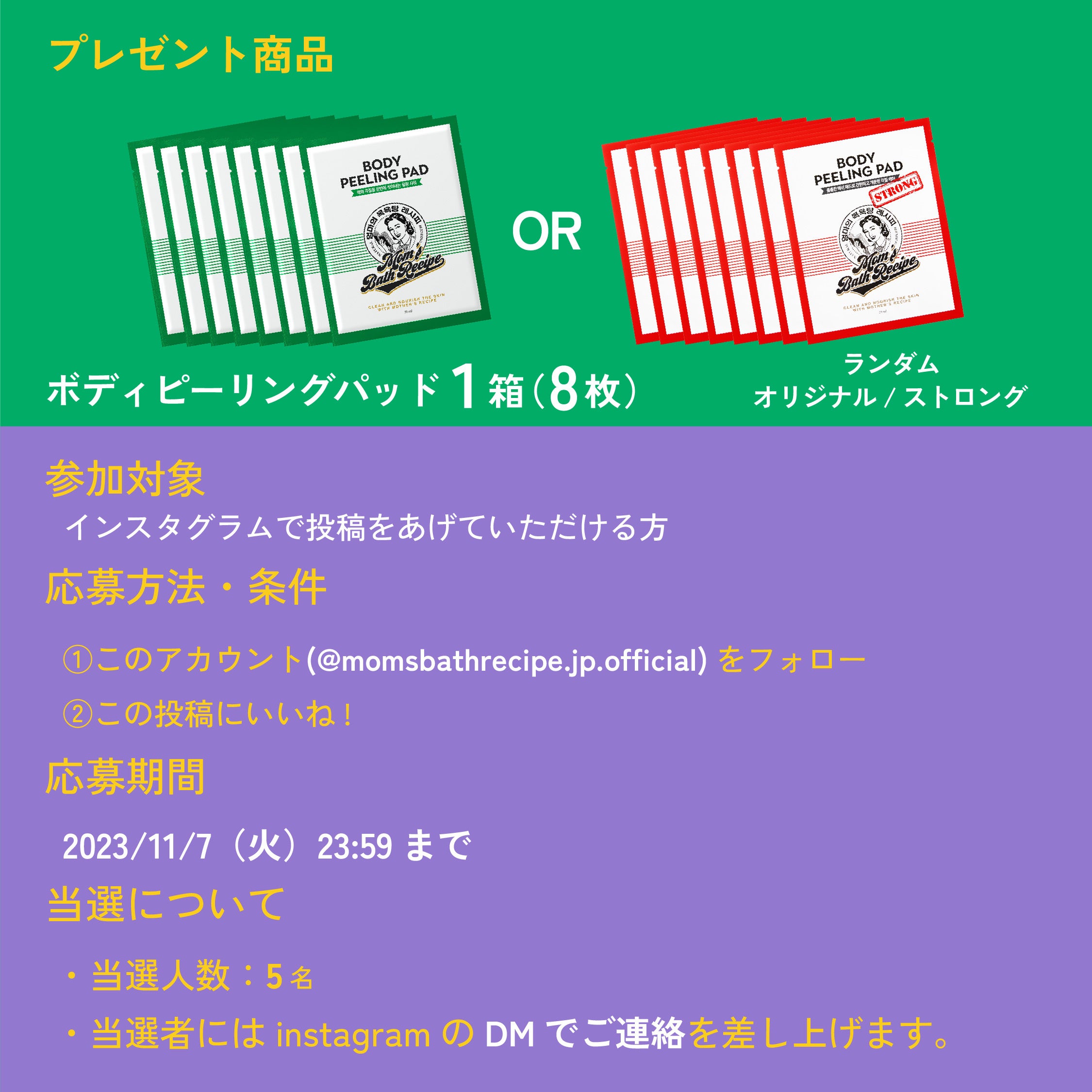 2024年1月31日(水)までに「Mom’s Bath Recipe ボディピーリングパッド」をお試しいただいた感想と、本商品が写った写真を、ご自分のInstagramアカウント上にて投稿。