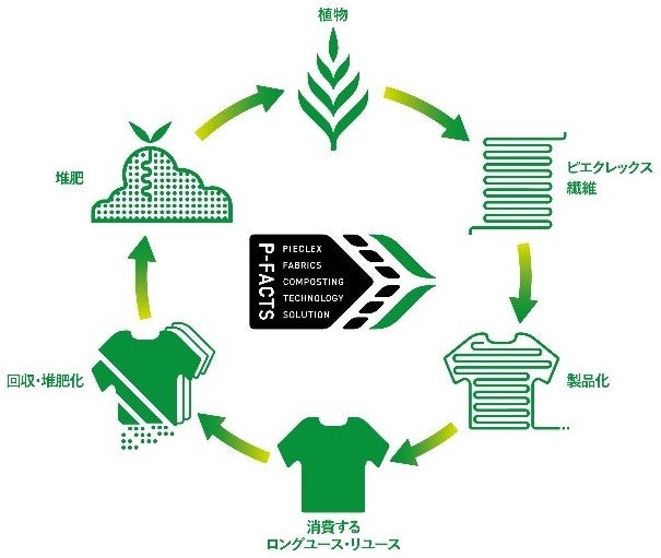 「P-FACTS」(PIECLEX Fabrics Composting Technology Solution)は、ピエクレックス社が主導し、植物由来のポリ乳酸を原料とした素材である「電気の繊維」ピエクレックスを使用したアパレル製品や繊維製品を回収し、林業や農業での利活用を目的とする堆肥化までを、パートナー企業、自治体、福祉施設、学校法人等、多くのステークホルダーと連携・共創し構築した、透明性高い循環インフラです。