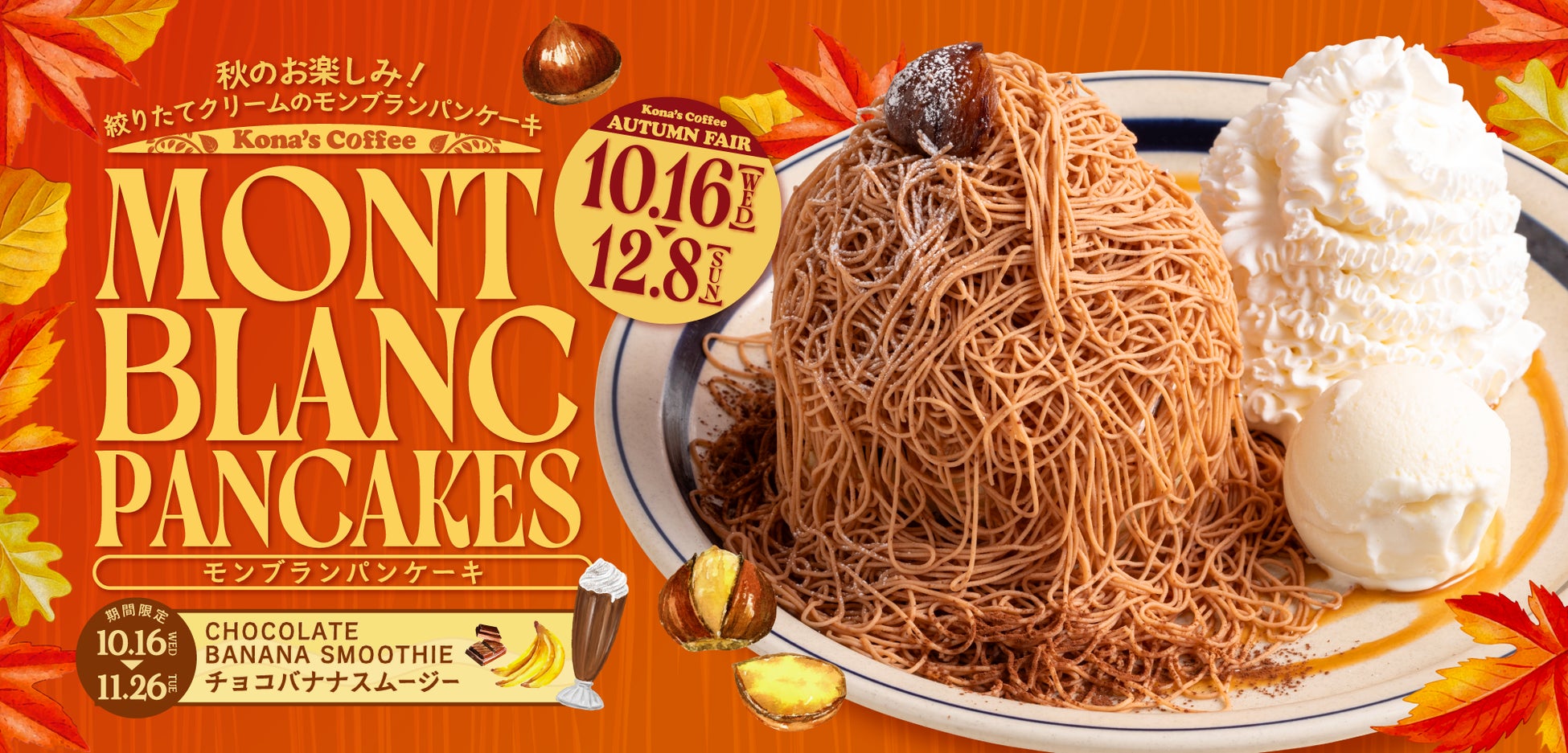 株式会社KONA’S(本社:東京都渋谷区、代表取締役社長:阿部 和剛)が展開する、食の感動体験を追求し「いちばん近いハワイ」をコンセプトに掲げるハワイアン カフェ・レストラン「コナズ珈琲」は、2024年10月16日(水)から12月8日(日)までの間、秋の限定メニュー「モンブランパンケーキ」を販売いたします。