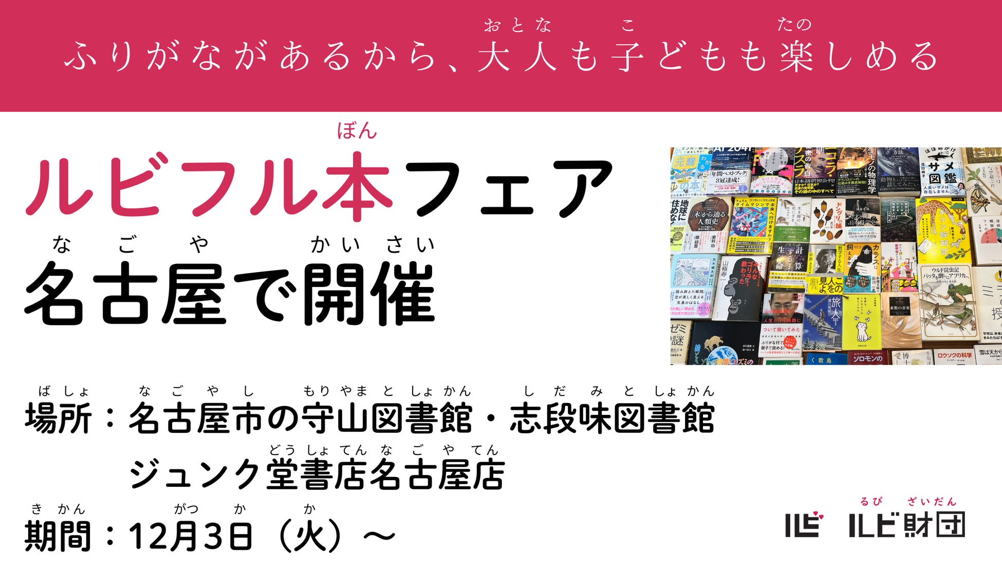 社会にふりがな(ルビ)を適切に増やすことで、あらゆる人が学びやすく、多文化が共生する「ルビフル」な社会づくりを目指す一般財団法人 ルビ財団(所在地:東京都港区、代表理事:伊藤 豊、以下ルビ財団)は、名古屋市のジュンク堂書店名古屋店・守山図書館・志段味図書館にて12/3より、ふりがながあるから大人も子供もたのしめる「ルビフル本」の選書フェアが開催されることをお知らせします。なお、12/7には、ジュンク堂書店名古屋店でコラボ企画として「ルビフルな本を探せ!ルビ採取ツアー」が実施されます。