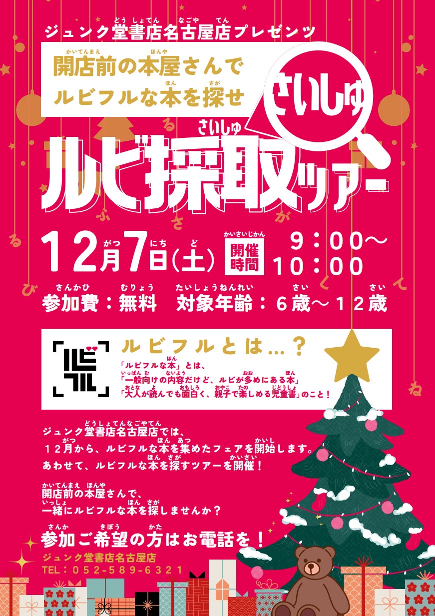 12/7にはコラボ企画として、ジュンク堂書店名古屋店店内で「ルビフルな本を探せ!」ツアーを実施