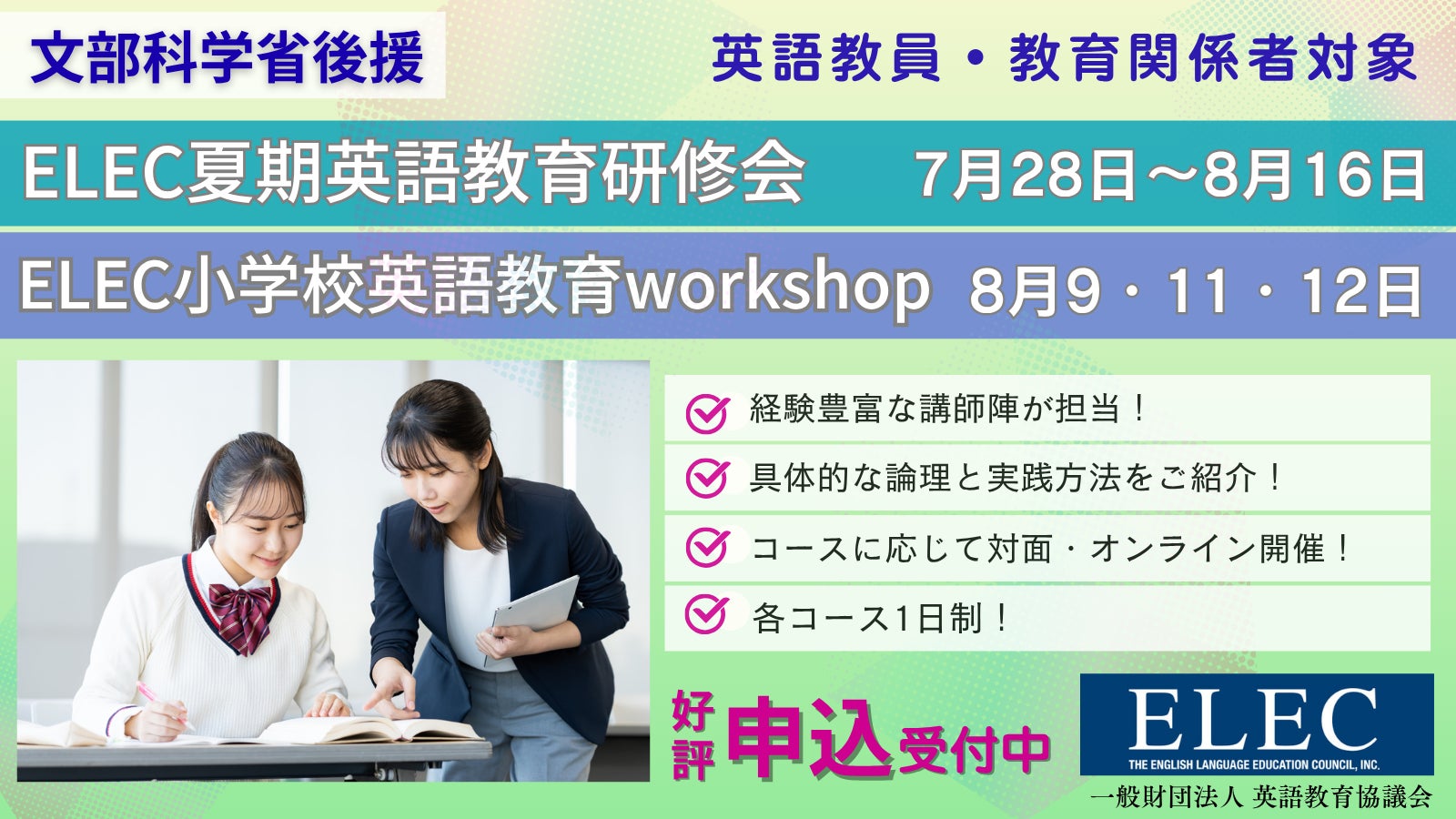 【申込受付中】文部科学省後援 2025年度ELEC夏期英語教育研修会7/28 ~ 8/16、小学校英語教育workshop 8/9、11、12開催