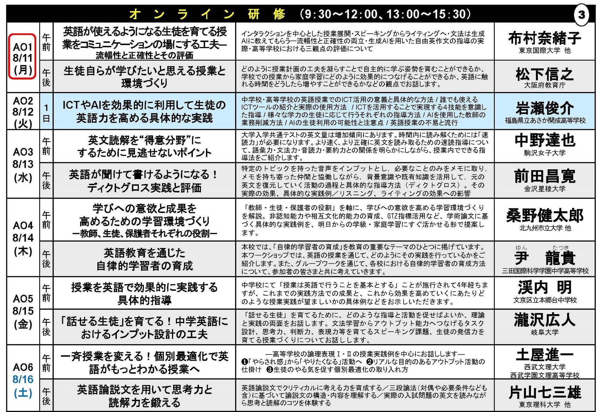 オンライン研修: 2025年8月9日(土) 対面研修:2025年8月11日(月・祝)、8月12日(火) |