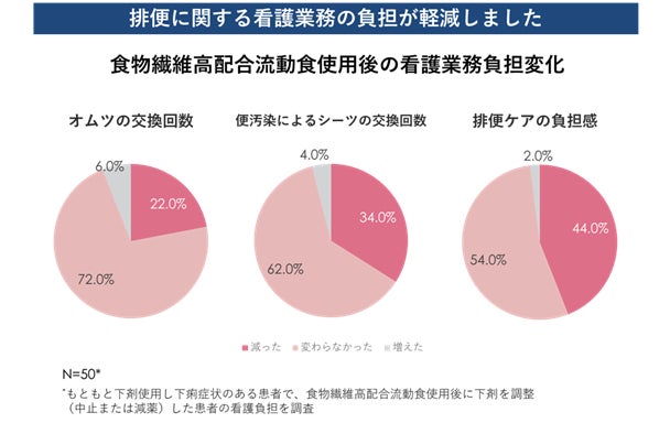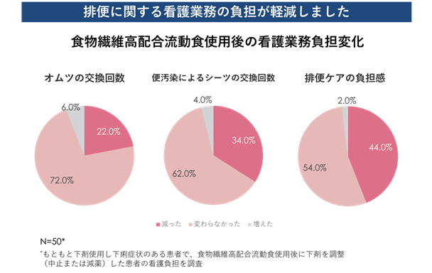 本調査の結果、特に食物繊維高配合流動食の使用に合わせて下剤の調整を行った患者で、より下痢によるオムツ交換やシーツ交換の回数が減少したケースが認められ、排便ケア業務の負担感が減少していました。