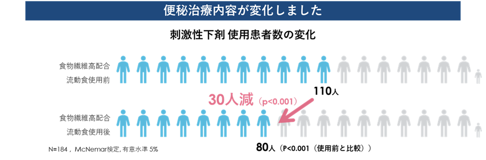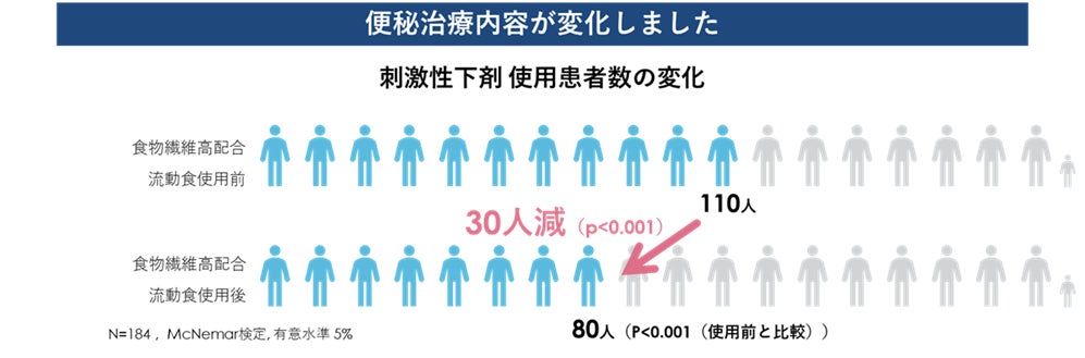 本調査の結果、食物繊維高配合流動食を使用する前に比べ、使用した後ではジフェニール系刺激性下剤の使用が顕著に減少していました。その他浸透圧下剤や浣腸の使用も減少していました。