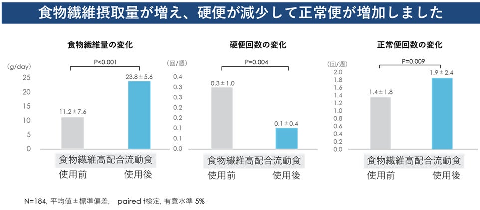 本調査の結果から、食物繊維高配合流動食を使用する前は食物繊維摂取量が「日本人の食事摂取基準(2020 年版)」で定める摂取目標量(65歳以上の男性20g以上、女性17g以上)を下回っていましたが、食物繊維高配合流動食を使用した後では一日当たりの食物繊維摂取量が著しく増えて平均値で摂取 目標量を満たしました。また、便性状が改善し、硬便回数の減少と正常便回数の増加が明らかになりました。