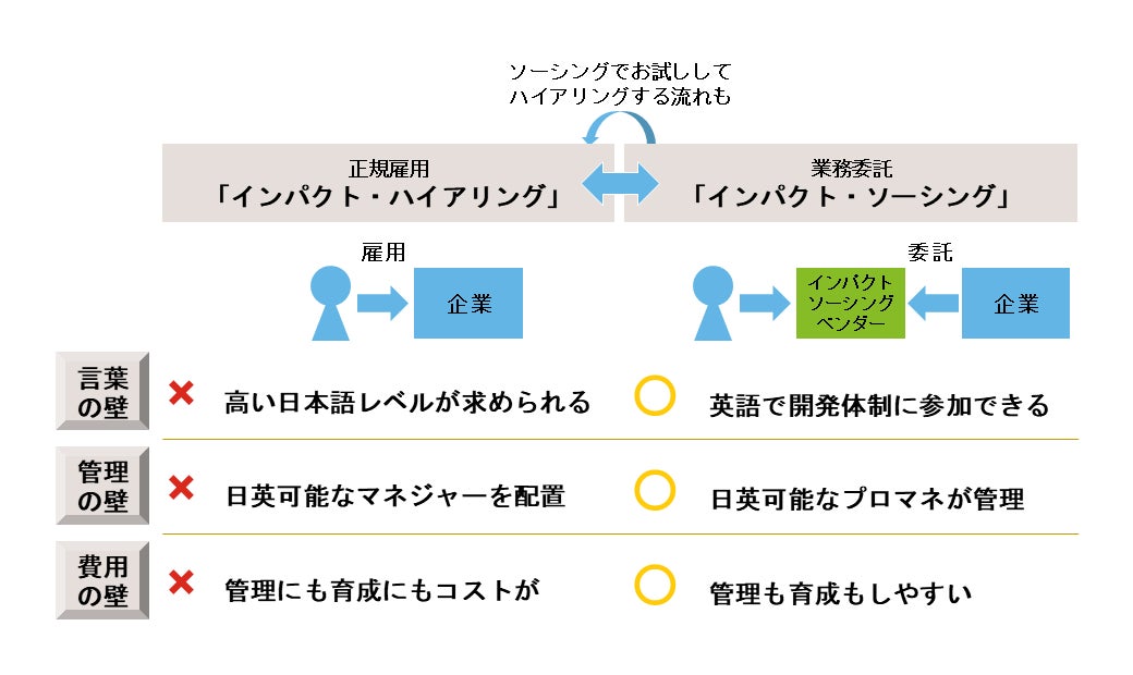 企業が「業務委託」を通じて、就労機会を繋ぐ新たな仕組みです。企業が就労困難性を抱える人々を「直接雇用」するインパクト ハイアリングと比較すると、正規雇用の場合は固定費となります。しかし、インパクト ソーシングであればアウトソースとして変動費化されるため、不景気の中でも取り組みやすいです。加えて、インパクト ソーシングがタレントのお試し機会となりインパクト ハイアリングにも繋がる可能性があるため、アンコンシャス バイアスと呼ばれる差別や偏見による不採用リスクに伴う機会損失も解消できます。難民移民の採用における様々な壁も、解消することが可能です。