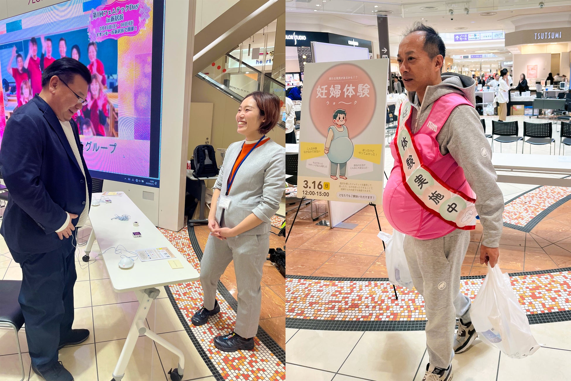 妊婦の気持ちを理解するきっかけとして、妊婦体験ジャケットを着用してイオンモール新居浜内を回遊していただくことで、疑似的に妊婦体験を行っていただきました。