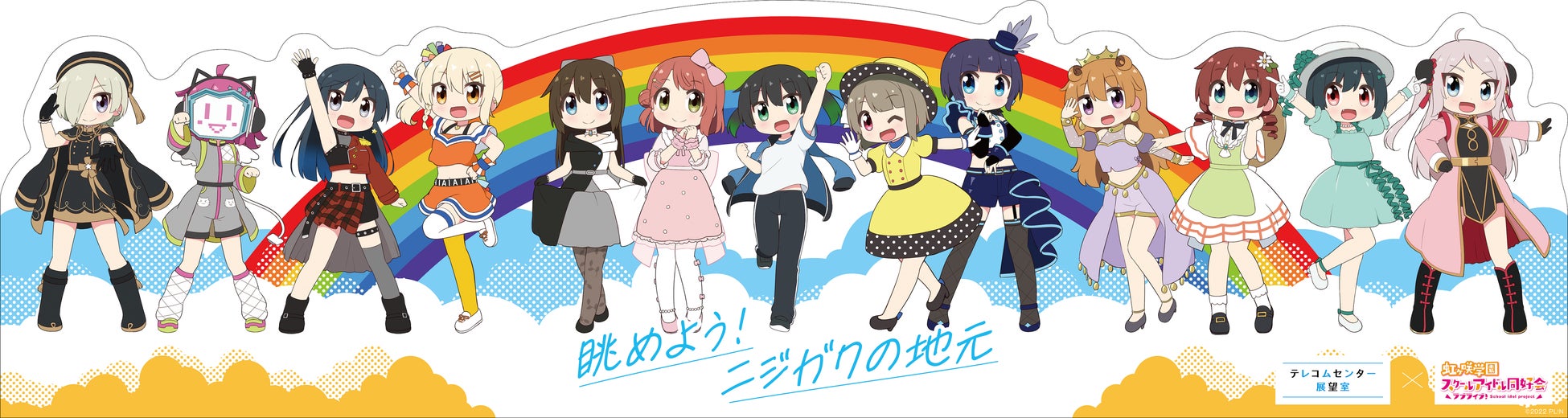 ・テレコムセンタービルの写真を背景に、ニジガクメンバーのポーズイラストと一緒に