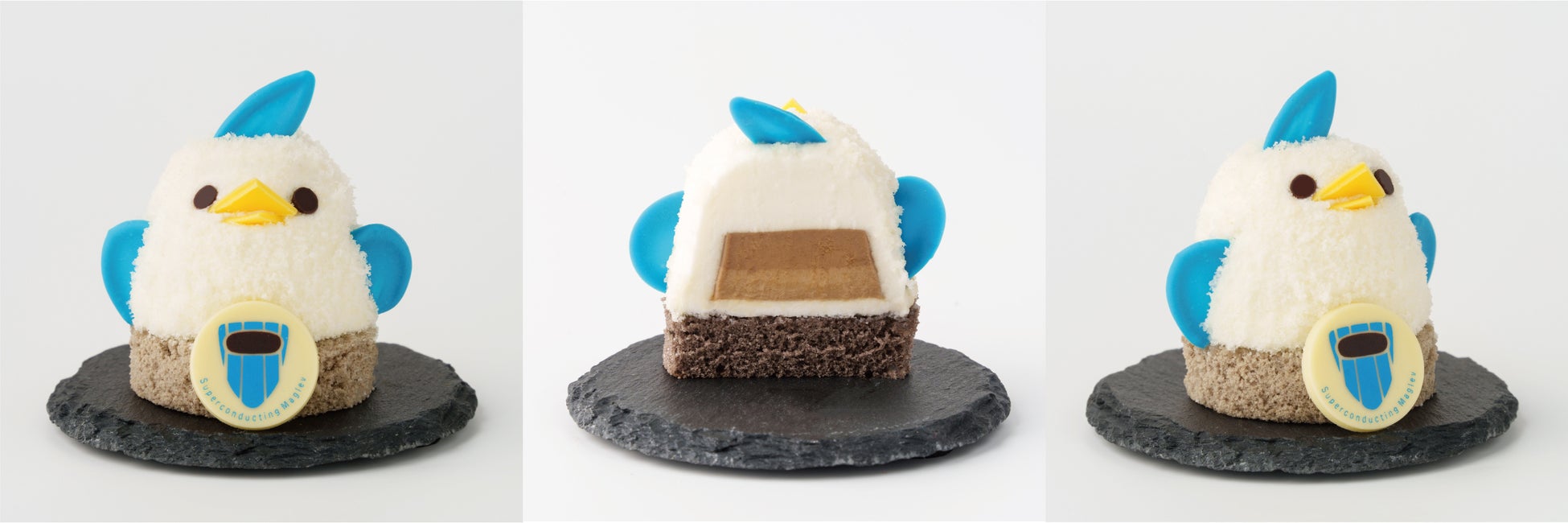 名古屋コーチンの卵を使用したコーヒー味のプリンを、ホワイトチョコレートのババロアで包みこみ、リニア正面をデザインしたホワイトチョコレートが添えられています。羽とトサカはリニアの青の流線と同じ青色とし、リニアの“超電導磁石”を模した厚めのスポンジで、リニアが「浮上」して走る様子を表現しました!