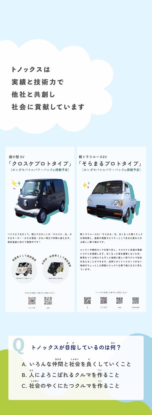 株式会社トノックス(本社:神奈川県平塚市、代表取締役社長:殿内崇生)は、2025年10月30日(木)~11月9日(日)(一般公開:10月31日(金)~)に東京ビッグサイトで開催される JAPAN MOBILITY SHOW 2025(東ホール、小間番号:E7314)に出展いたします。同社が車体組立を担当する超小型電気自動車「クロスケ」(nicomobi株式会社が開発・設計)「そらまる」を実機展示するとともに、クロスケ・そらまるが活躍する近未来の世界観を表現したコンセプトブースをお披露目します。本ブースのデザインや会場配布物には、産学連携プロジェクトによって生まれた学生たちの自由な発想がふんだんに取り入れられています。