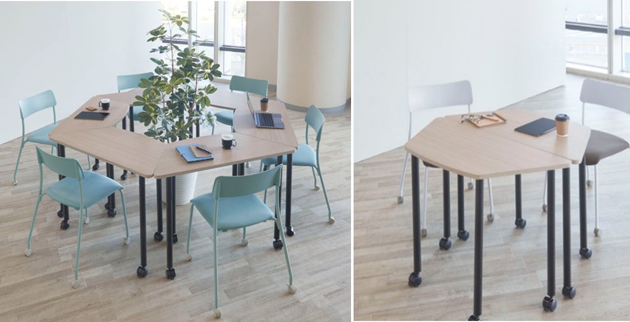 人数やスペースに合わせて自由にレイアウトできるミーティングテーブル。キャスター付きで移動も簡単です。