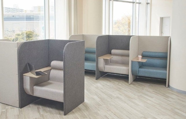 ブース型ソファ。仕事の合間のリフレッシュや、個人の集中スペース等に利用いただける適度なセミクローズド空間です。