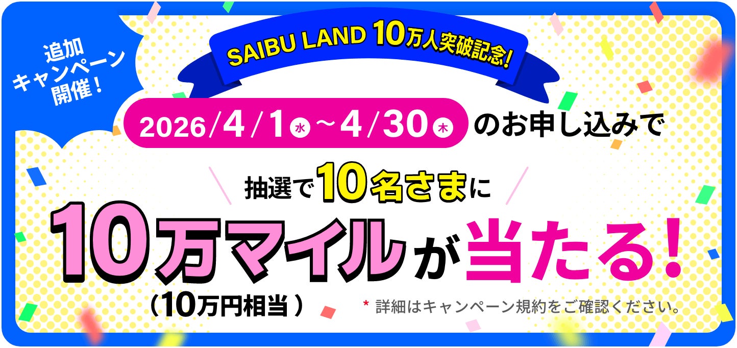 対象者の中から抽選で10名さまに、西部ガスグループの無料会員サービス「SAIBU LAND」(運営:西部ガスホールディングス株式会社)で利用できる10万マイルを進呈します。