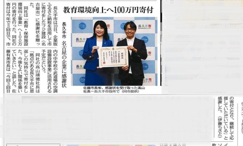 フジ建設株式会社(本社:愛知県名古屋市、代表取締役:髙山靖徳)は、企業版ふるさと納税制度(地方創生応援税制)を活用し、愛知県長久手市が推進する教育環境整備事業に対して100万円の寄付を行いました。