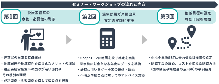 中小企業を対象に、全3回セミナー・ワークショップを実施。脱炭素経営の必要性を理解するほか、実際に自社のScope1・2のCO2排出量の算定や削減目標の設定、削減手段までを学習し、脱炭素経営の実践を目指します。