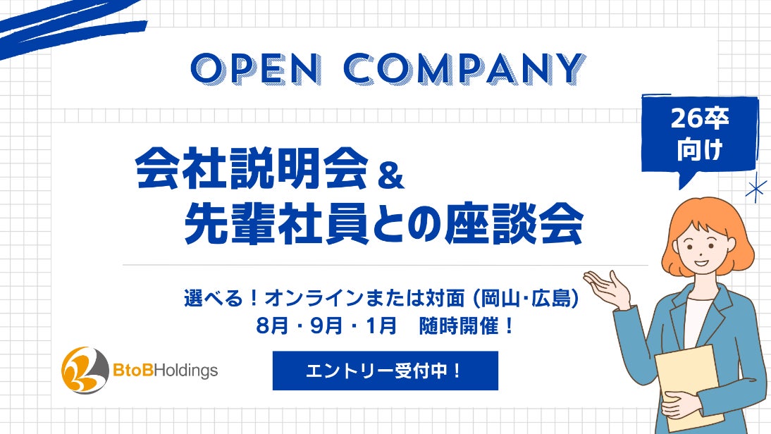 中国地方エリアを中心にWEBソリューションをはじめとしたBtoB総合サービス業を展開する株式会社BtoBホールディングス(本社:岡山県岡山市、代表取締役:仁科 慎太郎)は、2026年卒業予定の学生向けに、当社の仕事内容や会社の雰囲気を詳しく知ることができるオープン・カンパニーを初開催します。