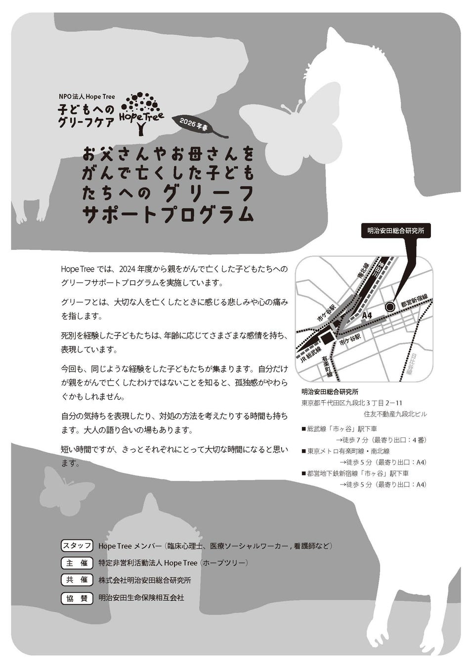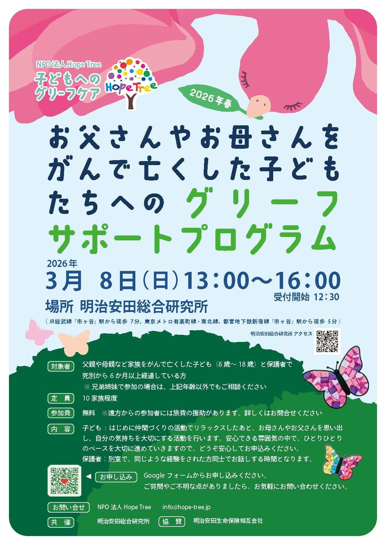 株式会社明治安田総合研究所(代表取締役社長 森本 律子、以下「明治安田総合研究所」)は昨年に引き続き、2026 年3月 8 日(日)に、特定非営利活動法人Hope Tree(以下「Hope Tree」)と、「お父さんやお母さんをがんで亡くした子どもたちへのグリーフサポートプログラム」を共催いたします。
