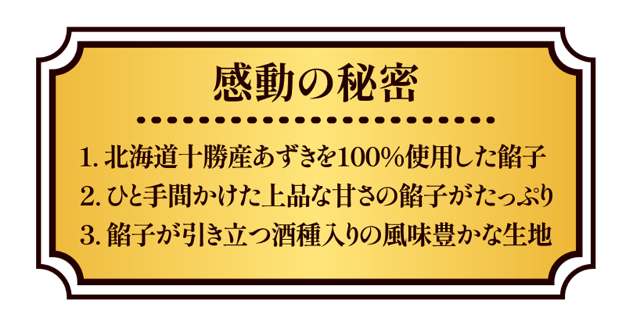 「あずき本来の味が楽しめるあんこ」の“おいしさ”と「ぎっしり詰まっている」という“驚き”=『感動』 を味わって頂きたいという思いを込め、商品名を名付けました。