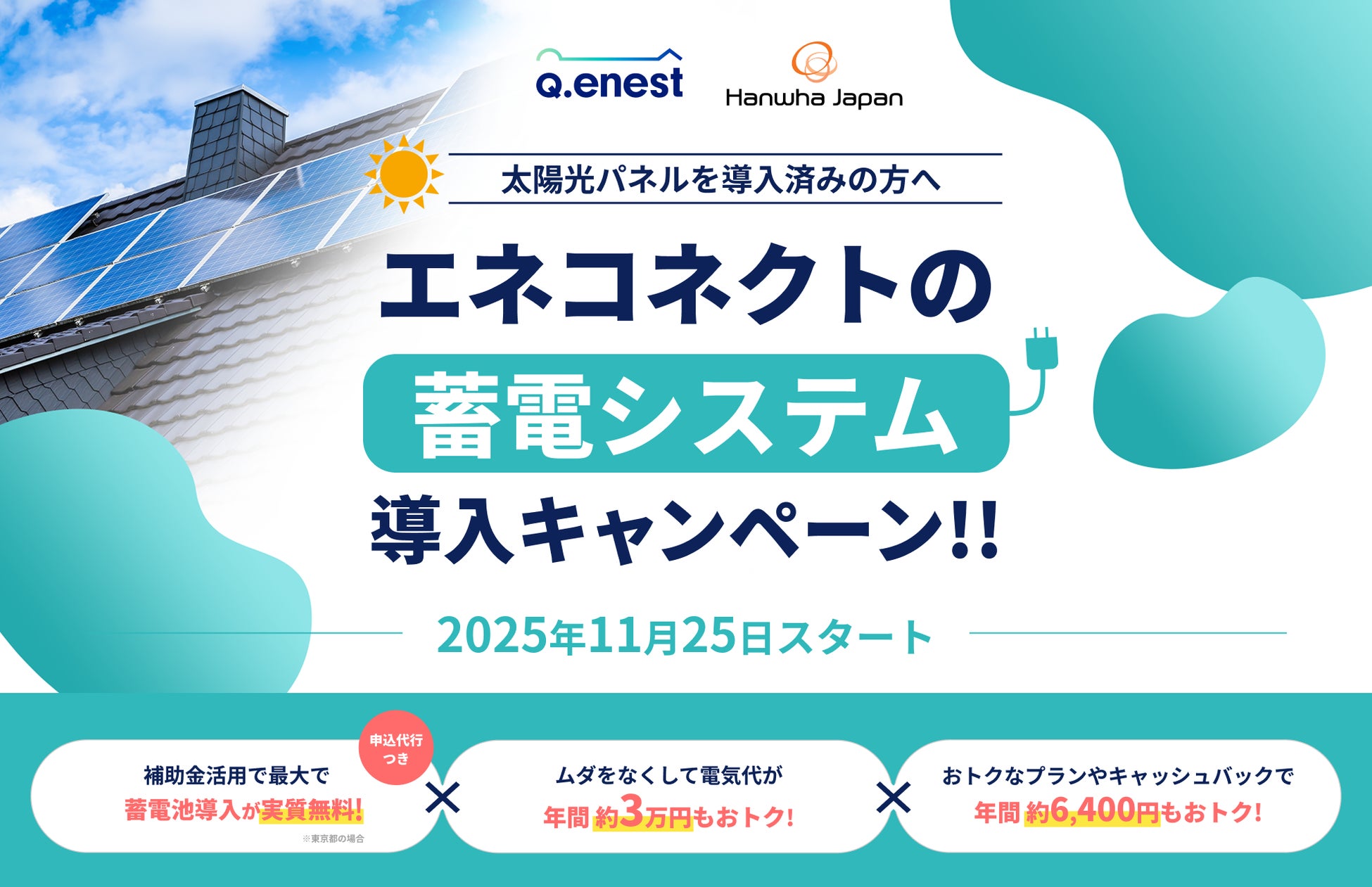 Q.ENESTホールディングス株式会社(所在地:東京都港区、代表取締役:張 熙載 以下、Q.ENEST)は、固定価格買取制度(FIT)の買取期間が満了した(以下、卒FIT)ユーザー、および非FITユーザーを対象とした『エネコネクトの蓄電システム導入キャンペーン』(以下、本キャンペーン)を2025年11月25日(火)より開始いたします。