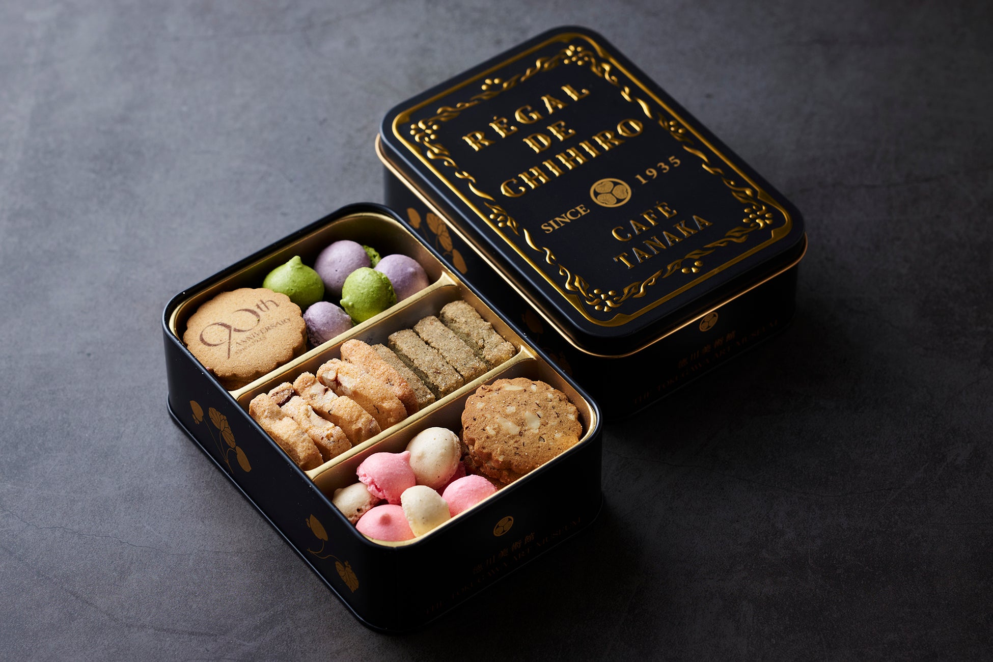 徳川の格式を感じさせる「墨色」の限定缶に、愛知県ならではの食材や家康ゆかりの素材を使用したクッキーをぎっしりと。限定クッキー「ほうじ茶サブレ」も入った90周年を記念する特別な内容です。