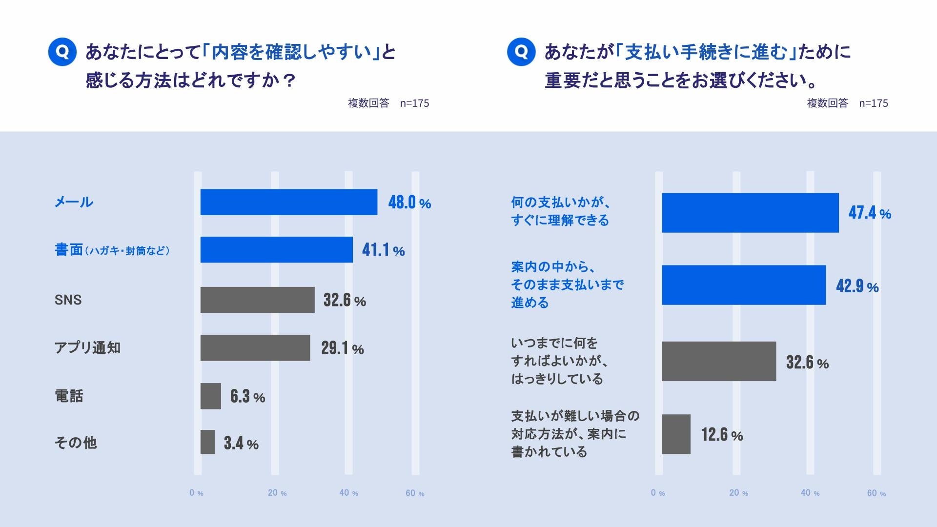 これらは、未払いの案内を設計するうえで、受け手の心理的負担を抑えつつ、支払い行動につながりやすい情報・導線・選択肢を整える必要があることを示唆しています。