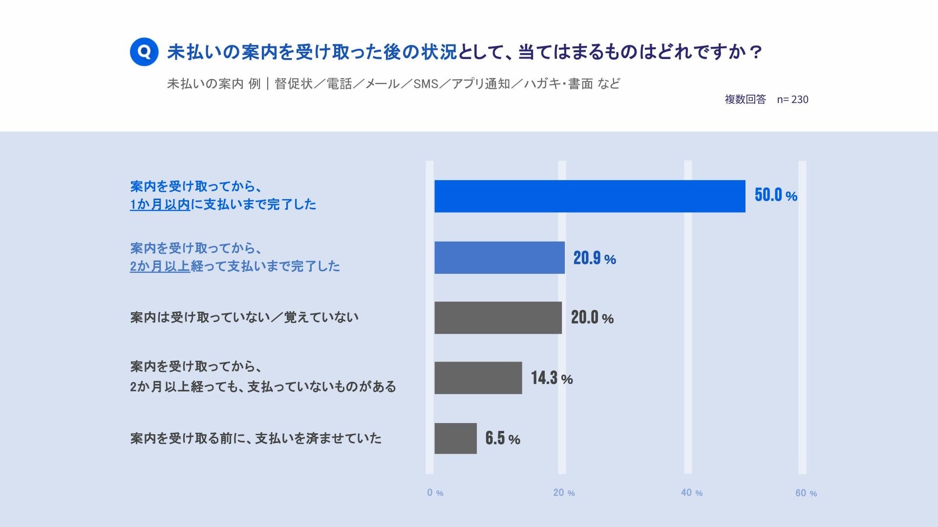 ・実際に、通知送付によって約半数(50.0%)が1か月以内に支払いを完了しており、適切な通知は「うっかり未払い」層の行動を促す有効な手段と考えられます。