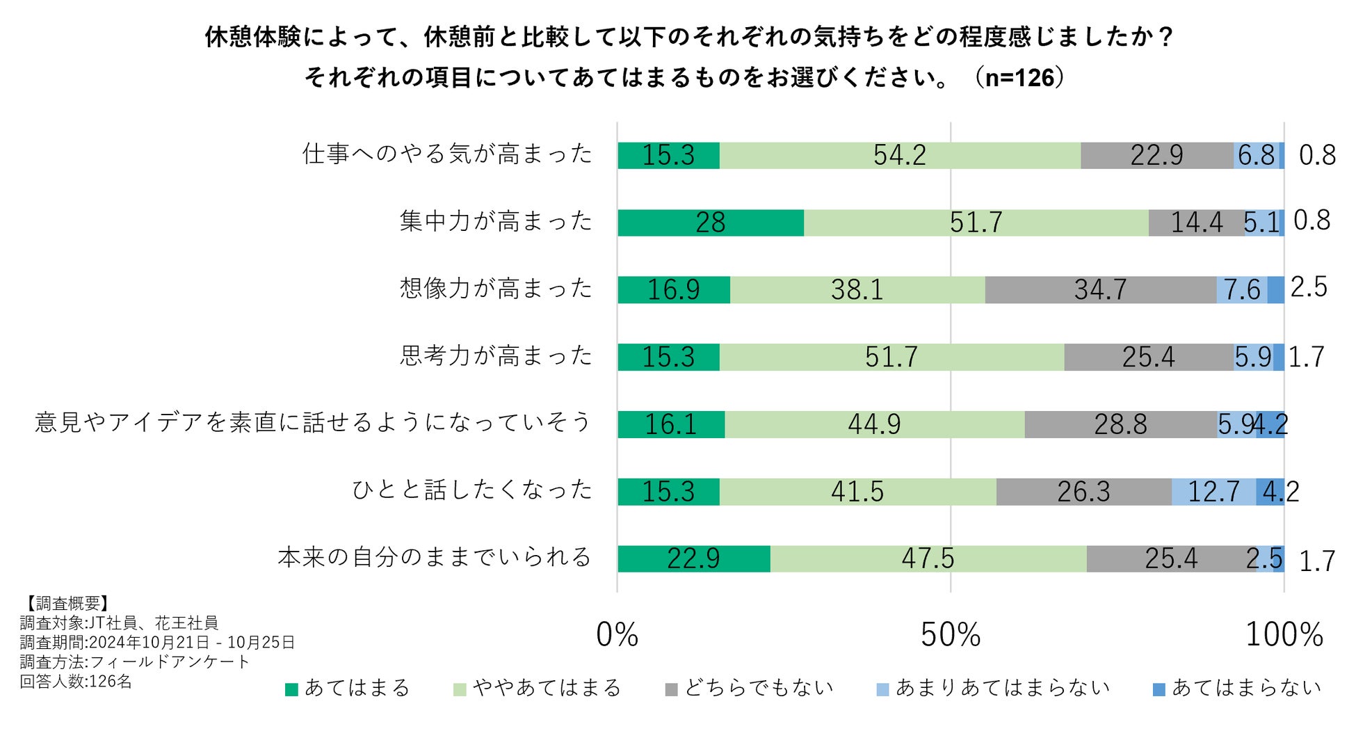 花王とJTの従業員計126名に対し、「心とからだが休まる休憩体験」後に実施したアンケートで休憩体験前後の仕事に関する気持ちの変化について聞いた質問では、【仕事へのやる気が高まった】や【意見やアイデアを素直に話せるようになっていそう】など全ての項目に対して半数以上が「あてはまる」「ややあてあまる」と回答する結果となりました。