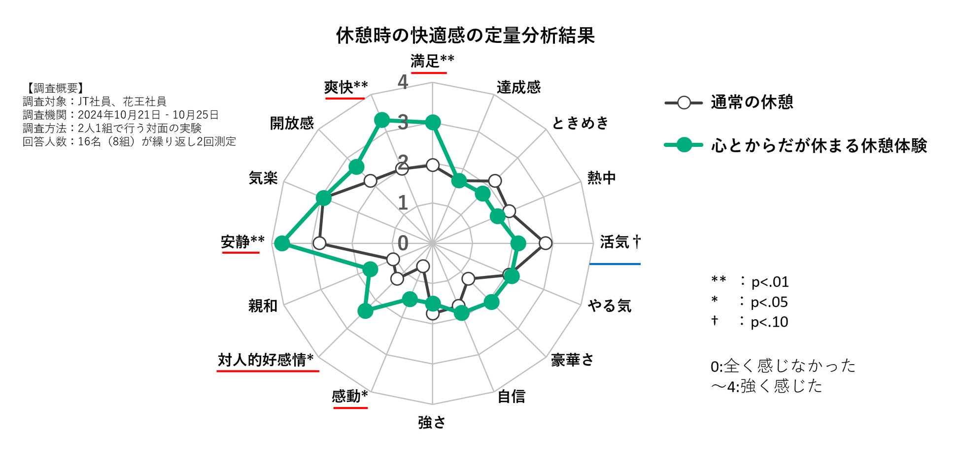 検証には、花王感覚科学研究所が開発した快適感を構成する16種類の感情を測定する方法を用いています。その結果「心とからだが休まる休憩体験」後では、通常の休憩後と比較して【対人的好感情】のほか、【感動】【満足】【安静】【爽快】といった感情が有意に高くなりました。