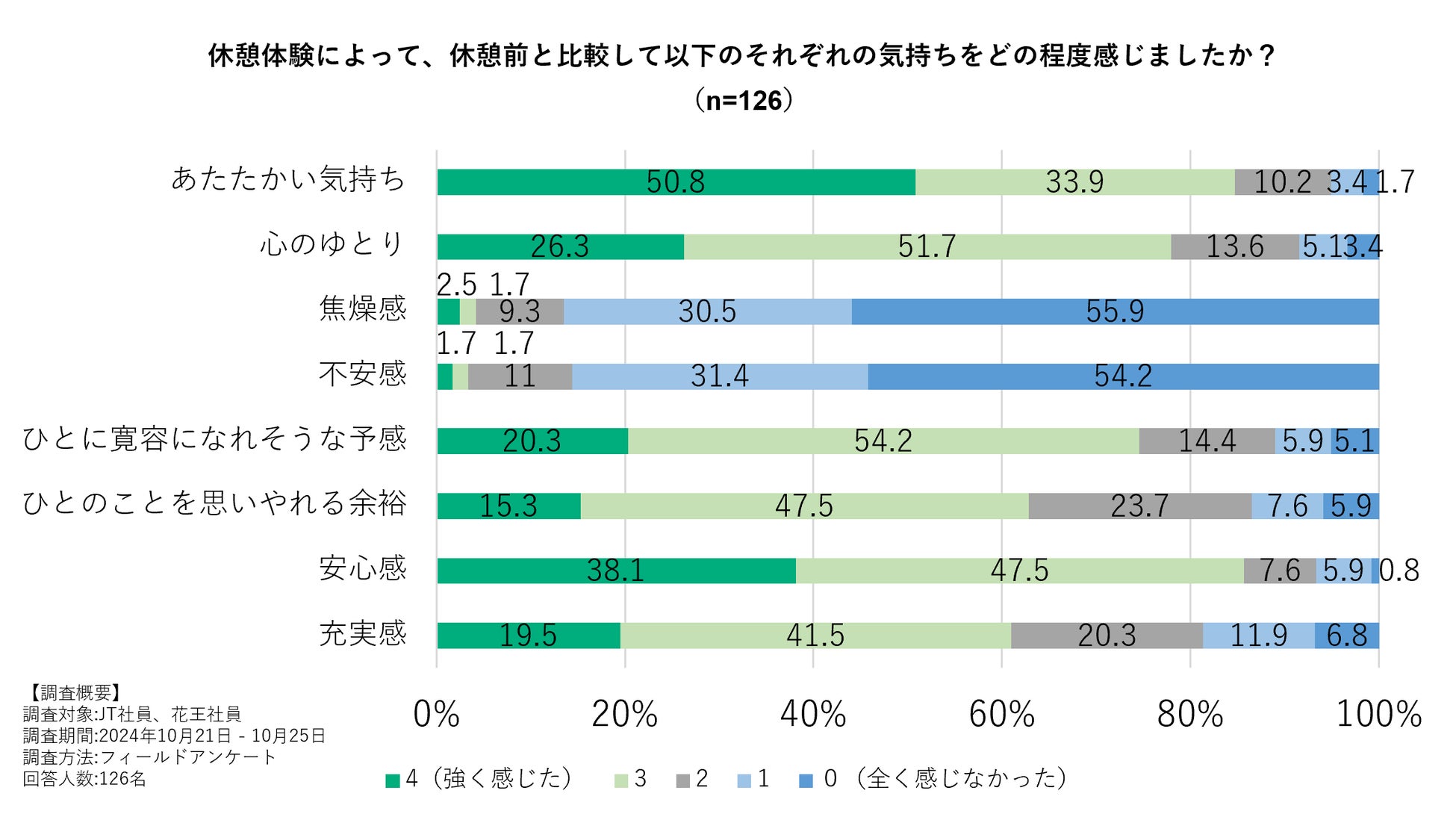 また花王とJTの従業員計126名に対し「心とからだが休まる休憩体験」後に実施したアンケートでは、休憩体験前後での気持ちの変化として【心のゆとり】を感じた人が78%、【安心感】を感じた人が85.6%と、休憩体験により心のゆとりや健やかさが生み出されたと考えられます。同時に、【ひとに 寛容になれそうな予感】を感じた人が74.5%、【ひとのことを思いやれる余裕】を感じた人が62.8%と対人的好感情・親和性の変化も見られました。