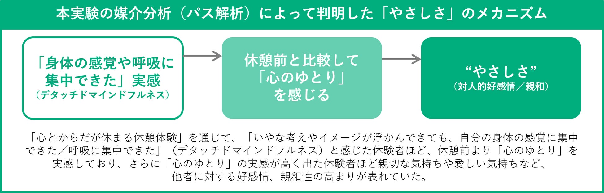 さらに媒介分析(パス解析)の結果から、こうした実感を得られた体験者ほど「心とからだが休まる休憩体験」前と比較して“心のゆとり”の実感が強く、【親切な気持ち】や【愛しい気持ち】をはじめとした他者への好感情(やさしさ)の高まりがみられることも分かりました。