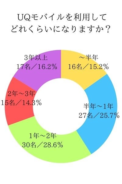 ・UQモバイルを利用している期間として、最も多かったのは1年〜2年で約30%だった。