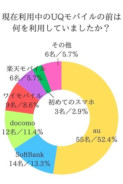 ・UQモバイルの前に利用していたキャリアは、auが最も多く約50%だった。