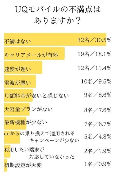 ・UQモバイルに対する最も多い不満は、キャリアメールが有料であることで約20%だった。