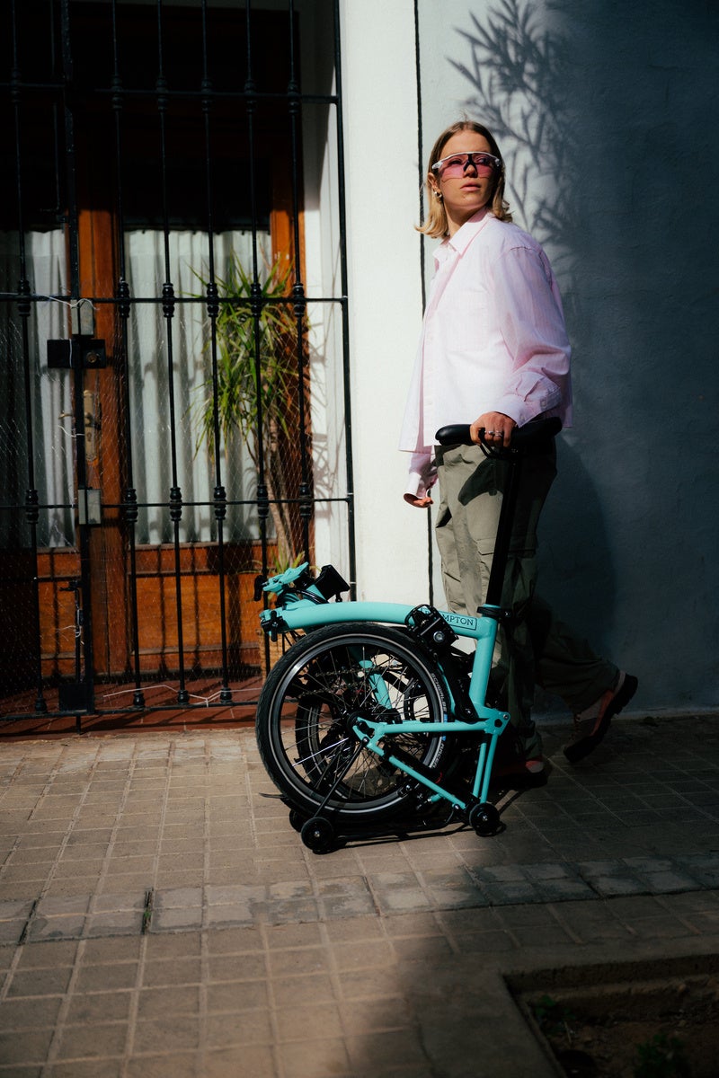 さらに、Bromptonの携帯性を新たなレベルに引き上げるアドバンス リア フレームにより、シートポストを半分までロックした状態で、折りたたんだBromptonを滑らせながらの移動が可能です