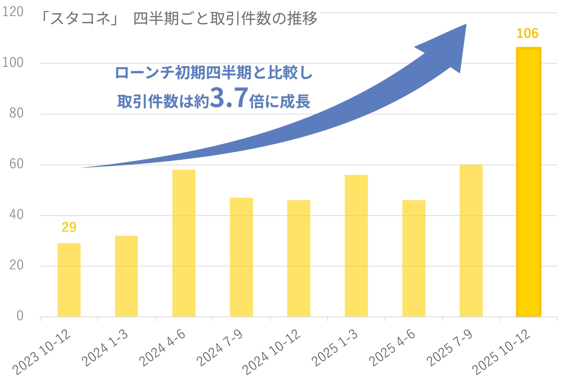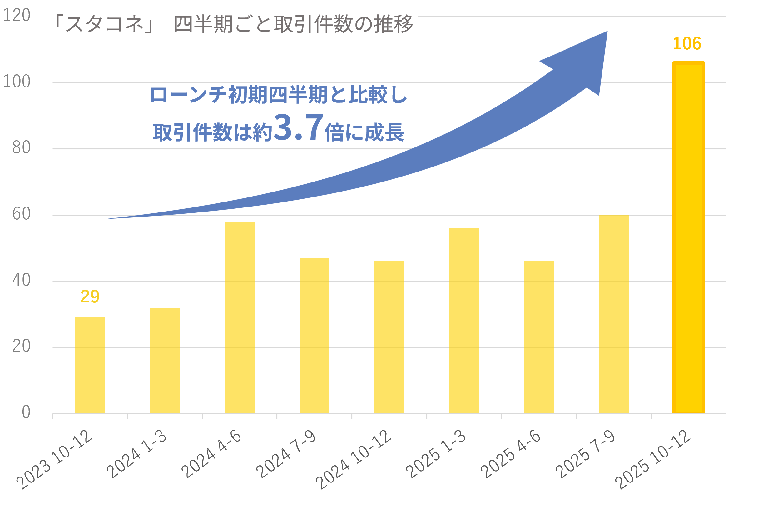 加えて、四半期ごとの取引件数も拡大しており、直近四半期はローンチ初期四半期と比較して約3.7倍に成長しています。また、直近四半期の成約率は32%と高水準を維持しており、累計成約率も29%まで上昇しています。これは、単なるマッチング数の増加にとどまらず、「スタコネ」でのマッチングが具体的な商取引機会へと進展する割合が高まっていることを示しています。