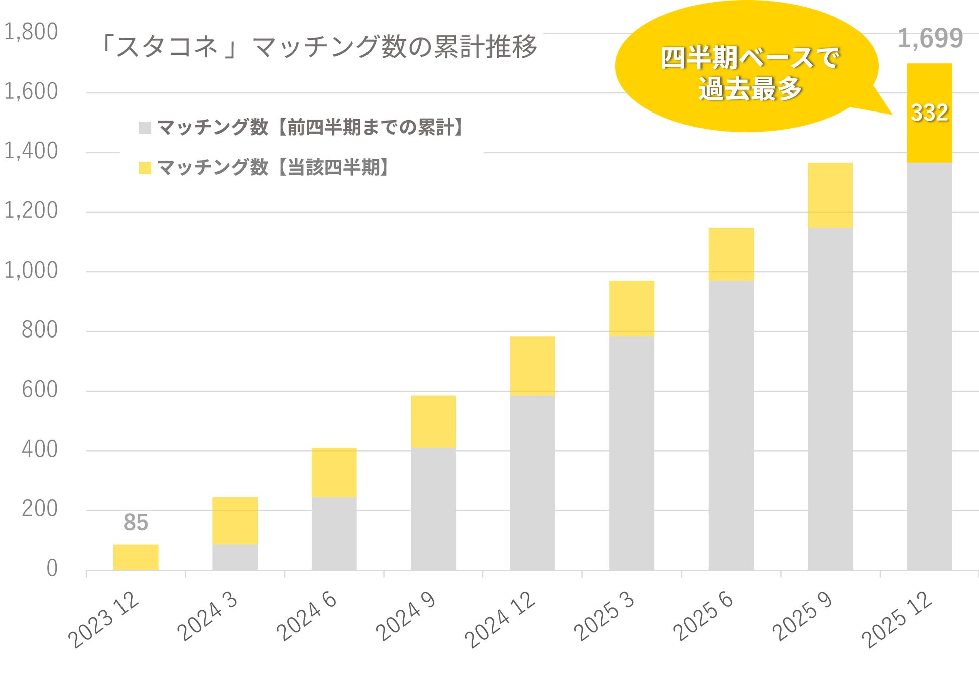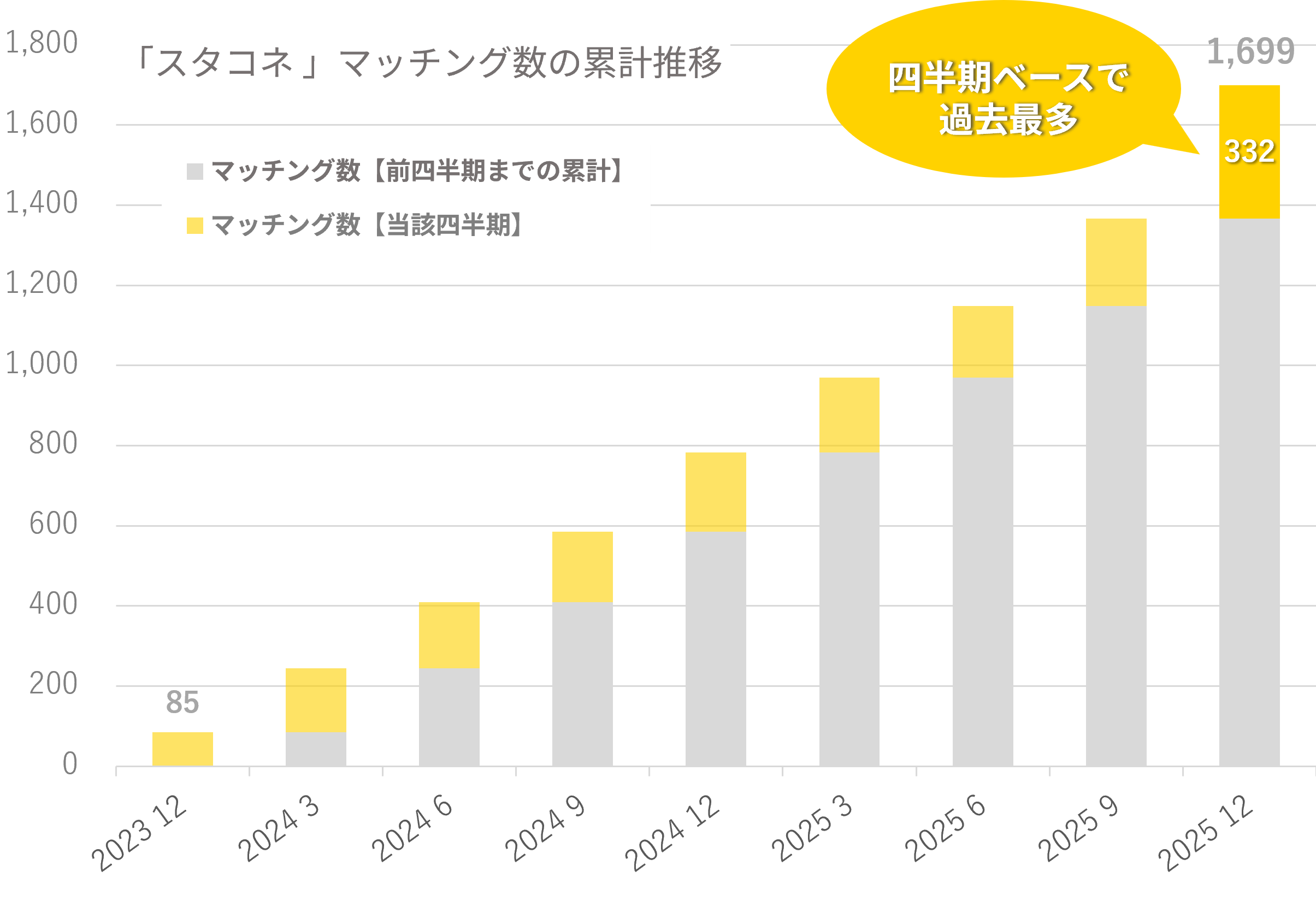 累計マッチング数1,699件のうち、直近の2025年10–12月期には、四半期として過去最多となる332件を記録しました。