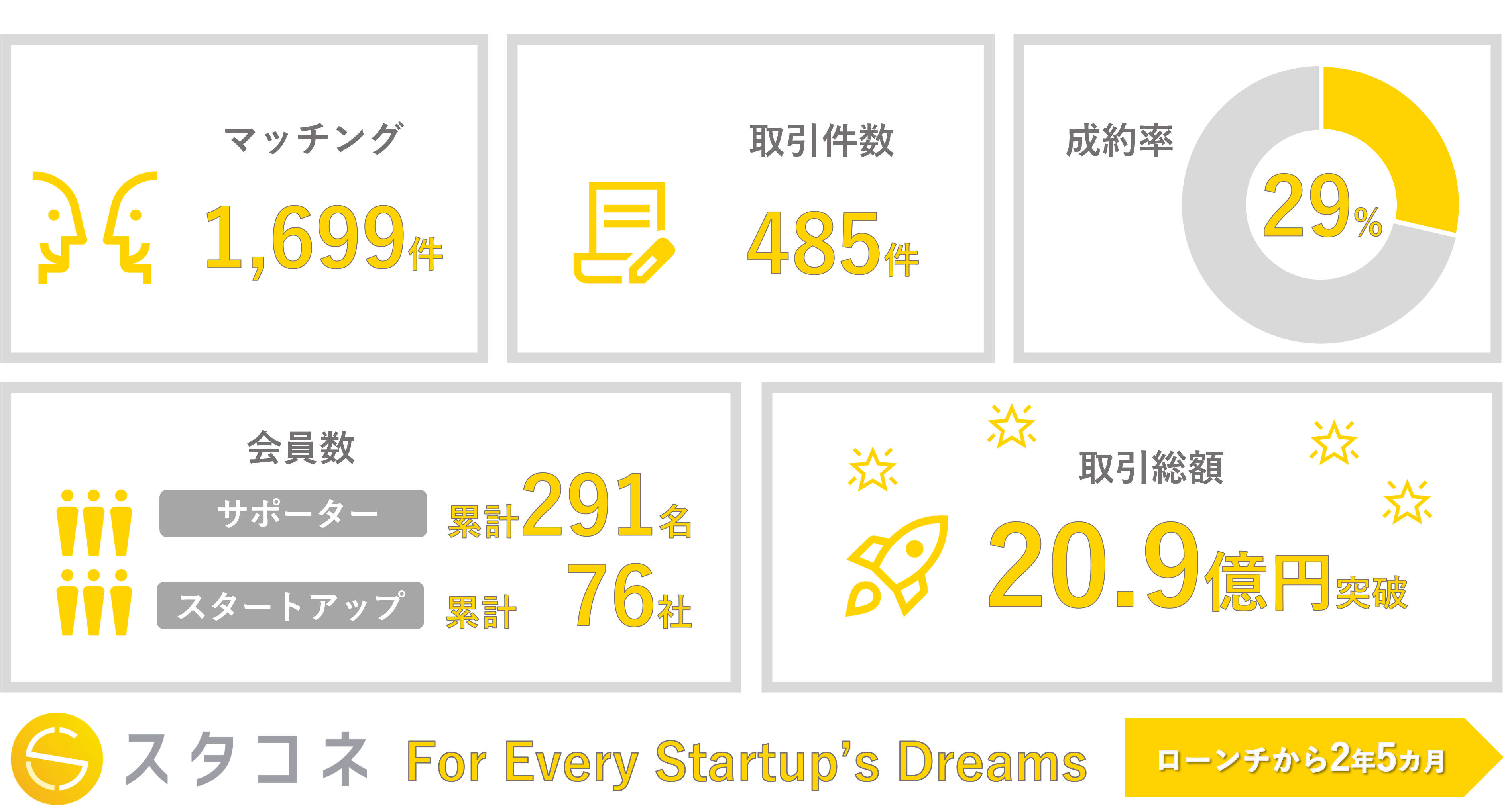 サービスローンチから約2年半で、2025年12月末時点における会員間の累計マッチング数は1,699件に達し、そのうち485件が実際の取引(商取引、提携、出資等)に結びついています。これらを合算した取引総額は20.9億円を突破し、「スタコネ」上で創出された経済活動の総量を示す指標として、事業成長の新たな段階に到達したことを示しています。