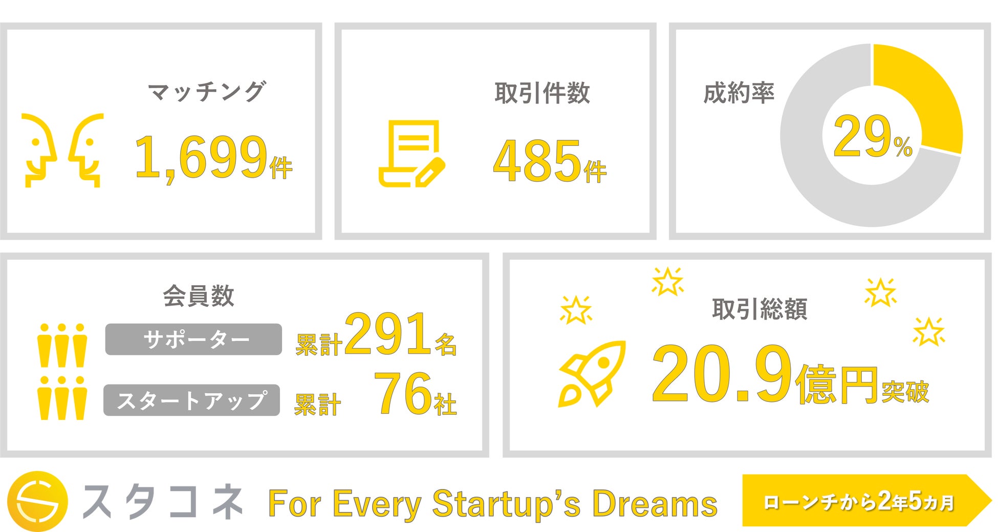 独自の審査プロセスを通過したスタートアップとサポーターをつなぐマッチングプラットフォーム「スタコネ」を運営する株式会社スタートアップコネクト(本社:東京都港区、代表取締役:寺岡大介、以下スタコネ)は、サービスローンチから約2.5年で、商取引、事業提携、出資等を含む取引総額(※1)が累計20億円を突破したことをお知らせします。
