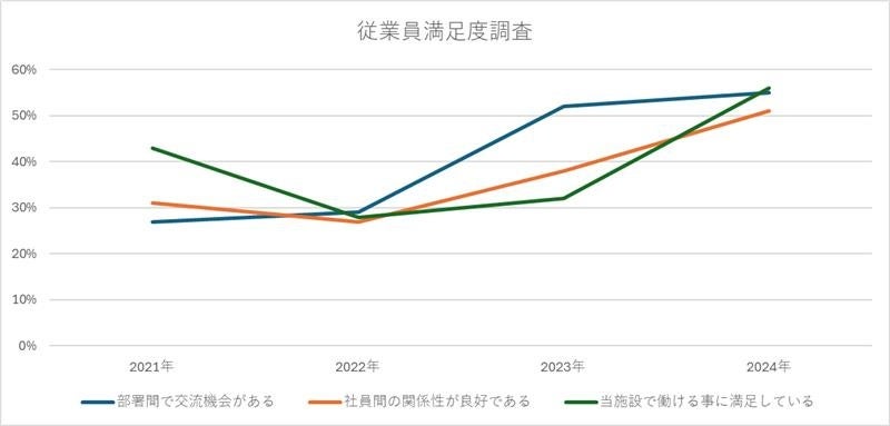親睦会では、ミスタードーナツやせんべいの食べ放題イベントを数日間連続で実施するなど、幅広い職員が気軽に参加できる内容を企画した。これにより、「お昼に1人で黙食している人が多い」という状況も改善されつつある。下記グラフからも分かる通り、従業員満足度調査においても2023年度から人間関係の改善に繋がっており、それが横濱かなざわ翔裕園で働くことへの満足度にも繋がっていることが数字でも明らかになった。