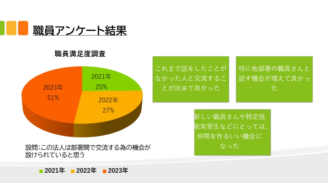 まず2023年に親睦委員会を発足し、職員に「親睦会でどのようなことをしたいか」をアンケートで調査した。このアンケート結果を基に、月1回の親睦会を開催し、職員同士が業務を離れて自然に交流できる場を設けた。活動の内容やその効果については、親睦委員会で毎回振り返りを行い、必要に応じて内容を改善した。さらに、職員満足度調査にある「職員同士の交流機会」に関する設問の結果を分析し、活動の評価や見直しに活用した。また、様々な職員が参加できるようにシフト調整を行い、皆が平等に参加できるように配慮した。